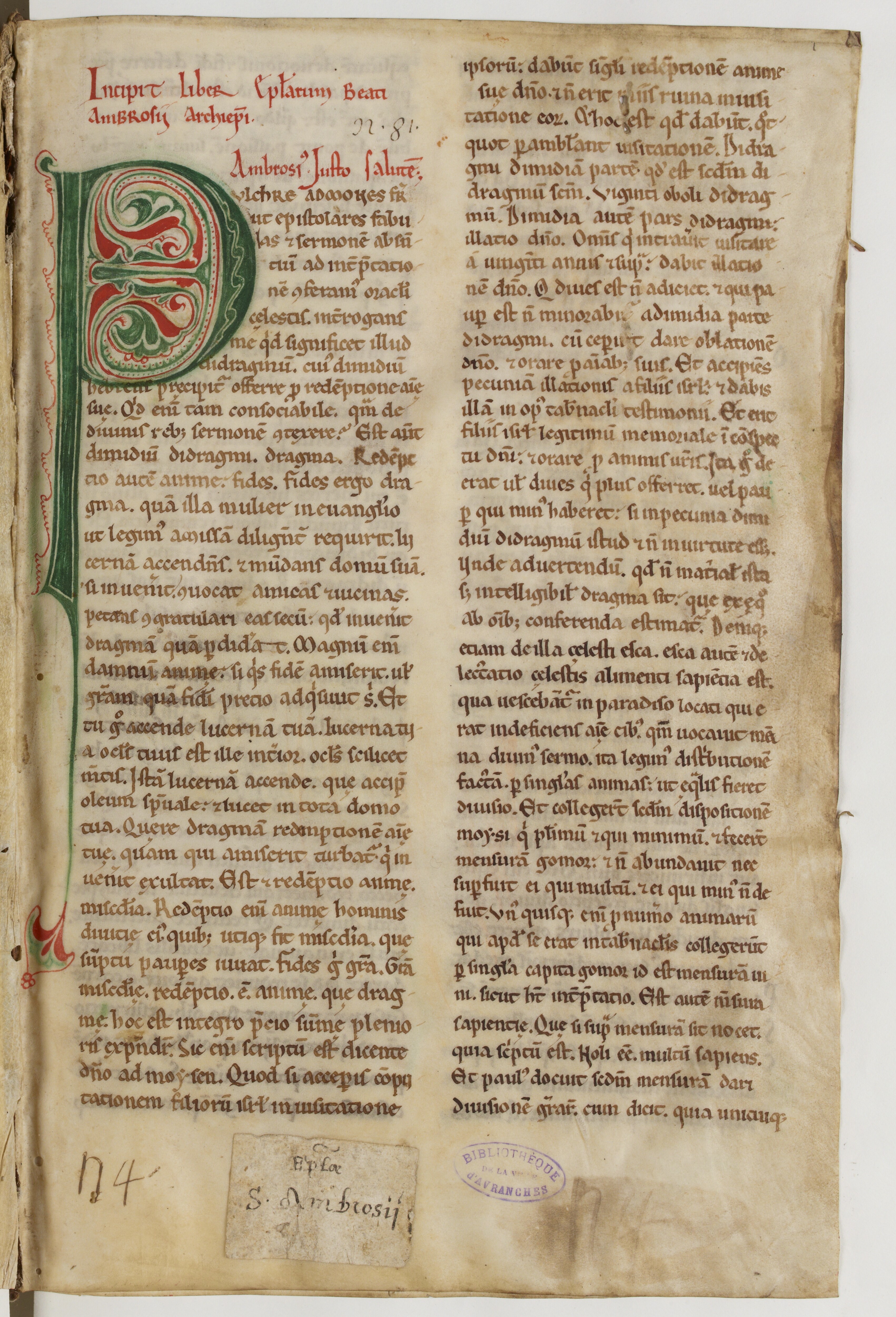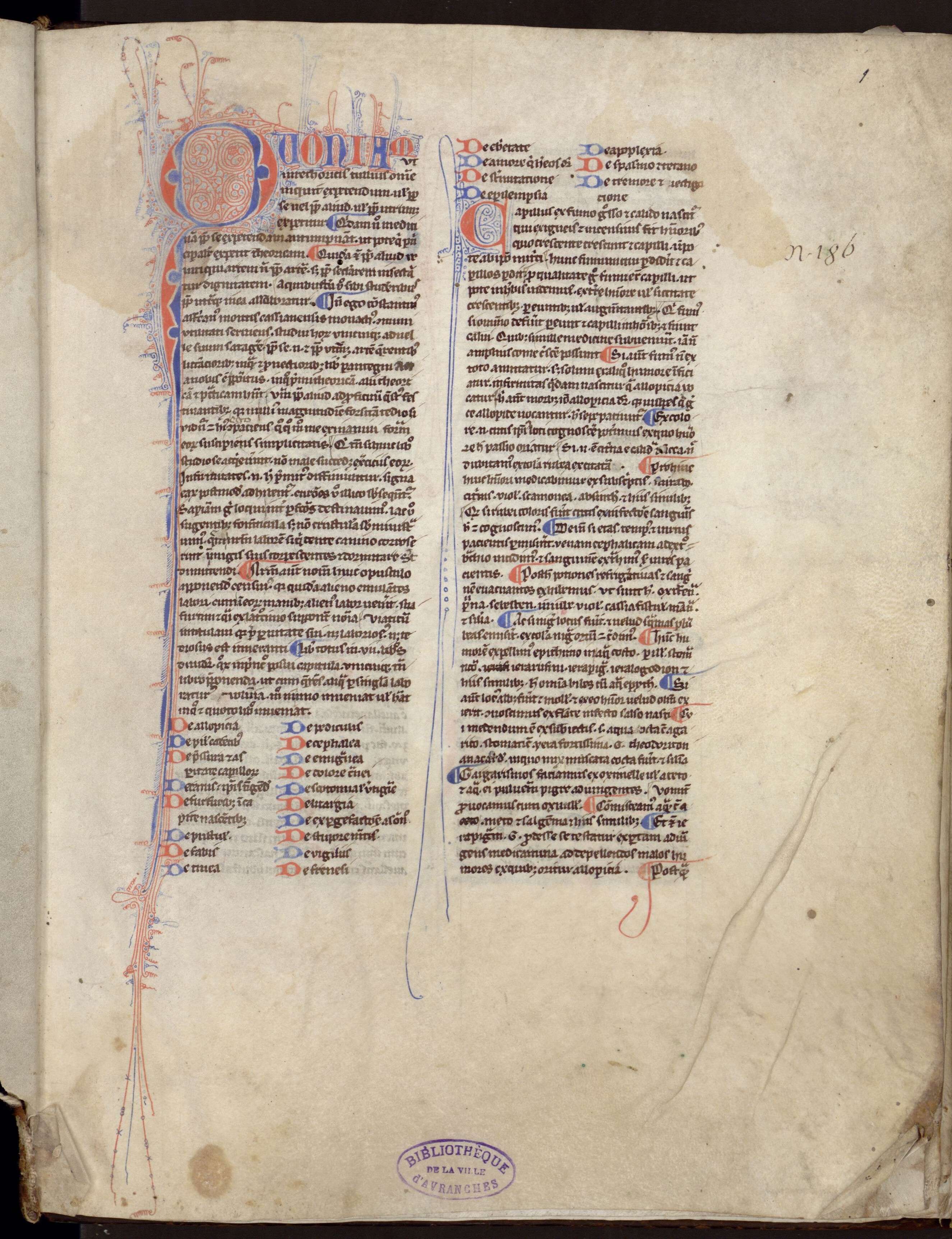 Cet ouvrage est un chef-d'œuvre de l’enluminure gothique produit au Mont Saint-Michel, sous l’abbé Raoul de Villedieu (v. 1223/5-1236). Entièrement entourée de vert, l’initiale F (« Fuit ») possède un fond d’or et des motifs géométriques qui remplissent l’intérieur de cette lettre ornées de dragons.
