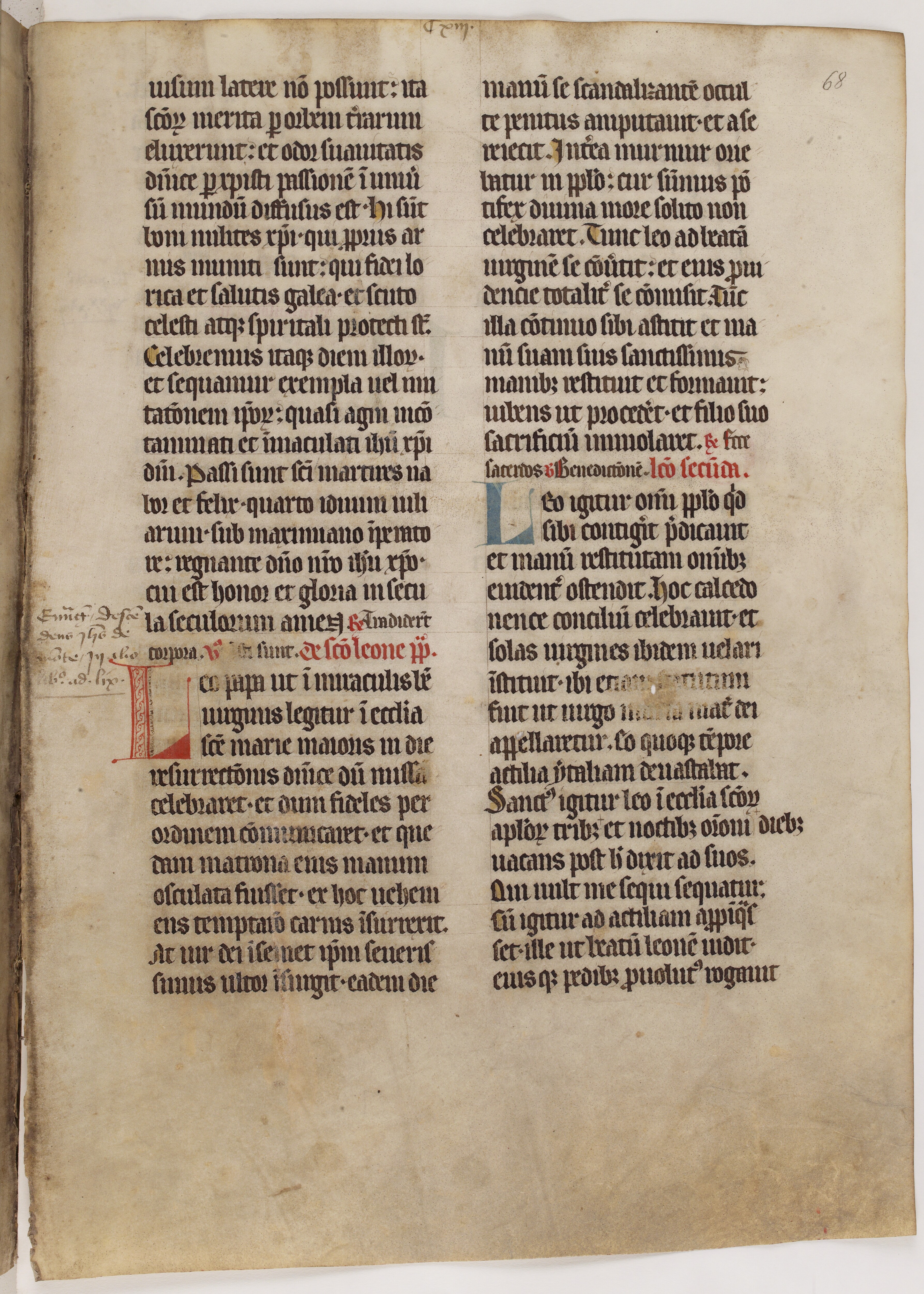 La lettre ornée L (« Leo papa ») ouvre les trois leçons, qui sont accompagnées par un répons et un verset. Dans la liturgie montoise, saint Léon est célébré le 28 juin. L’ensemble de l’ouvrage propose un décor assez sobre, avec des initiales de couleur rouge et bleue.