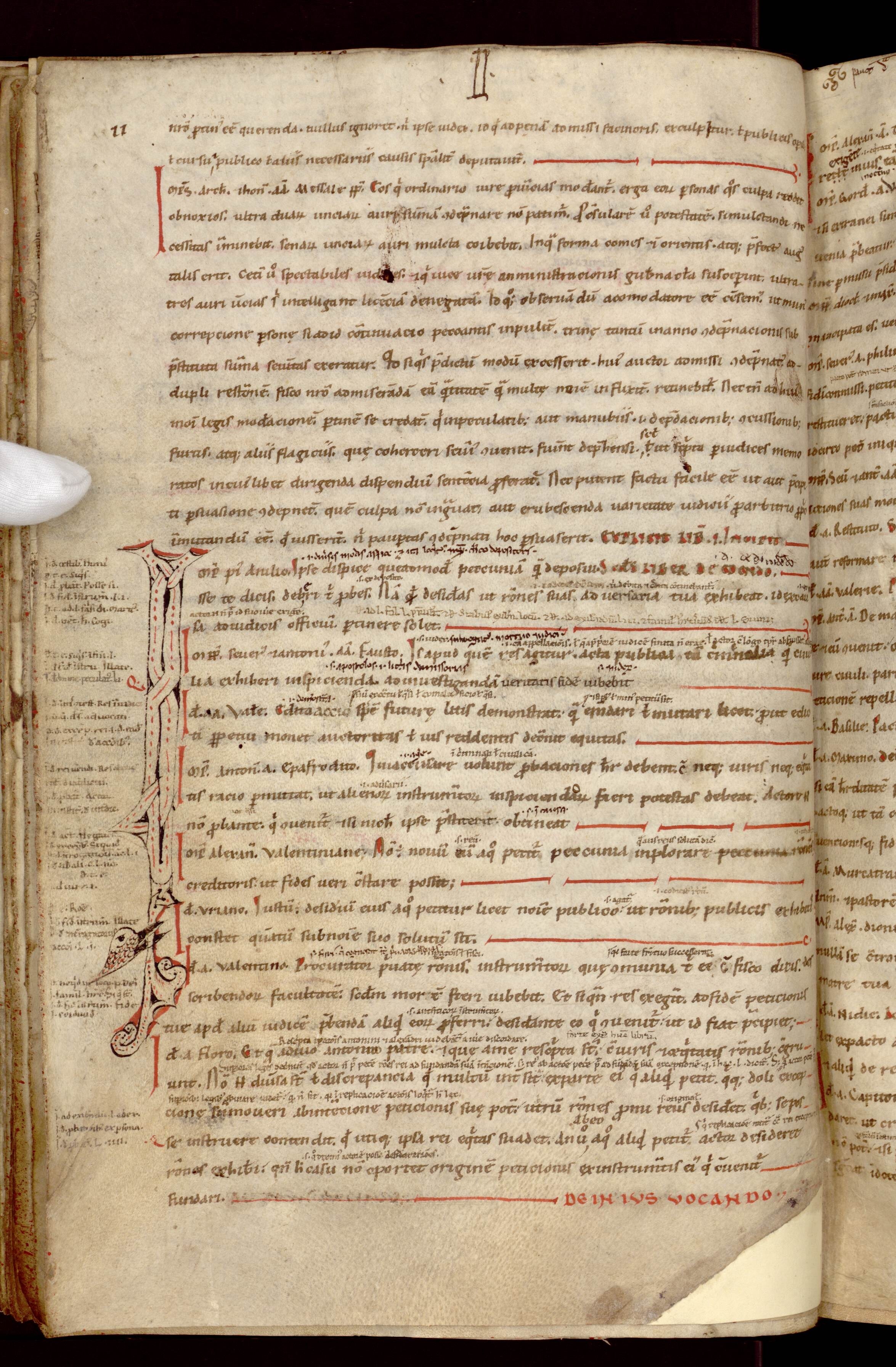 En dehors de cette belle lettrine I (« in »), ce volume est peu enluminé puisqu’il est certainement destiné avant tout à l’étude. Celle-ci se compose d’un réseau d’entrelacs sur fond bleu. Le choix d’associer ce Père de l’Église à un singe n’est pas anodin. Il s’agit d’un animal peu représenté à l’époque de cette copie, puisqu’il est jugé ambiguë (ni tout à fait positif, ni complètement négatif).