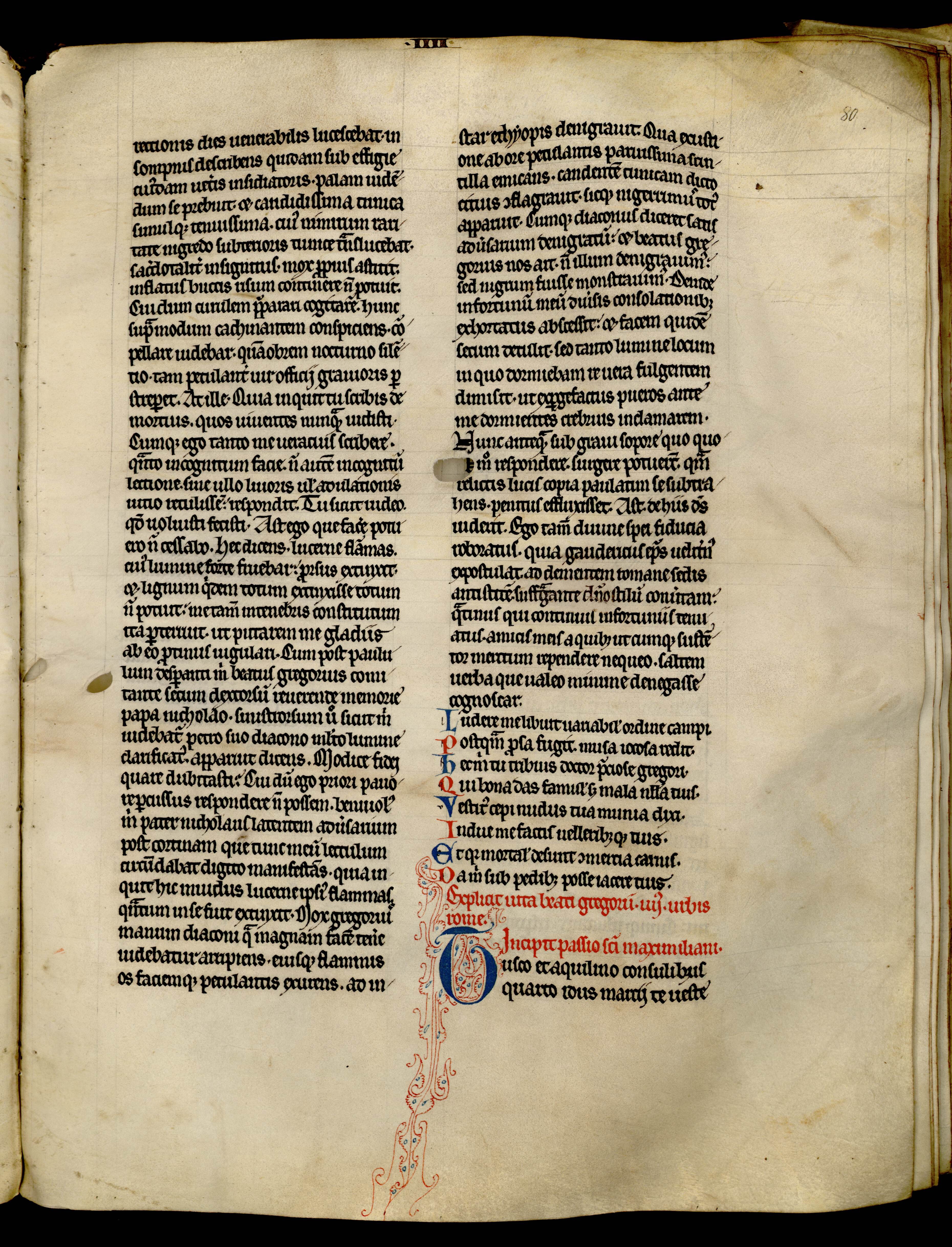 Sur cette double page, la vie de Maximilien est présentée. Né en 273, il est le fils d’un vétéran. Toutefois, il refuse de servir dans l’armée romaine qui occupe la Numidie. Comme le souligne directement ce manuscrit, à l’âge de 21 ans, il refuse de porter les armes, en raison de ses convictions religieuses. Ce saint fêté le 12 mars est condamné à mort par le proconsul parce qu’il refuse de revenir sur sa position.