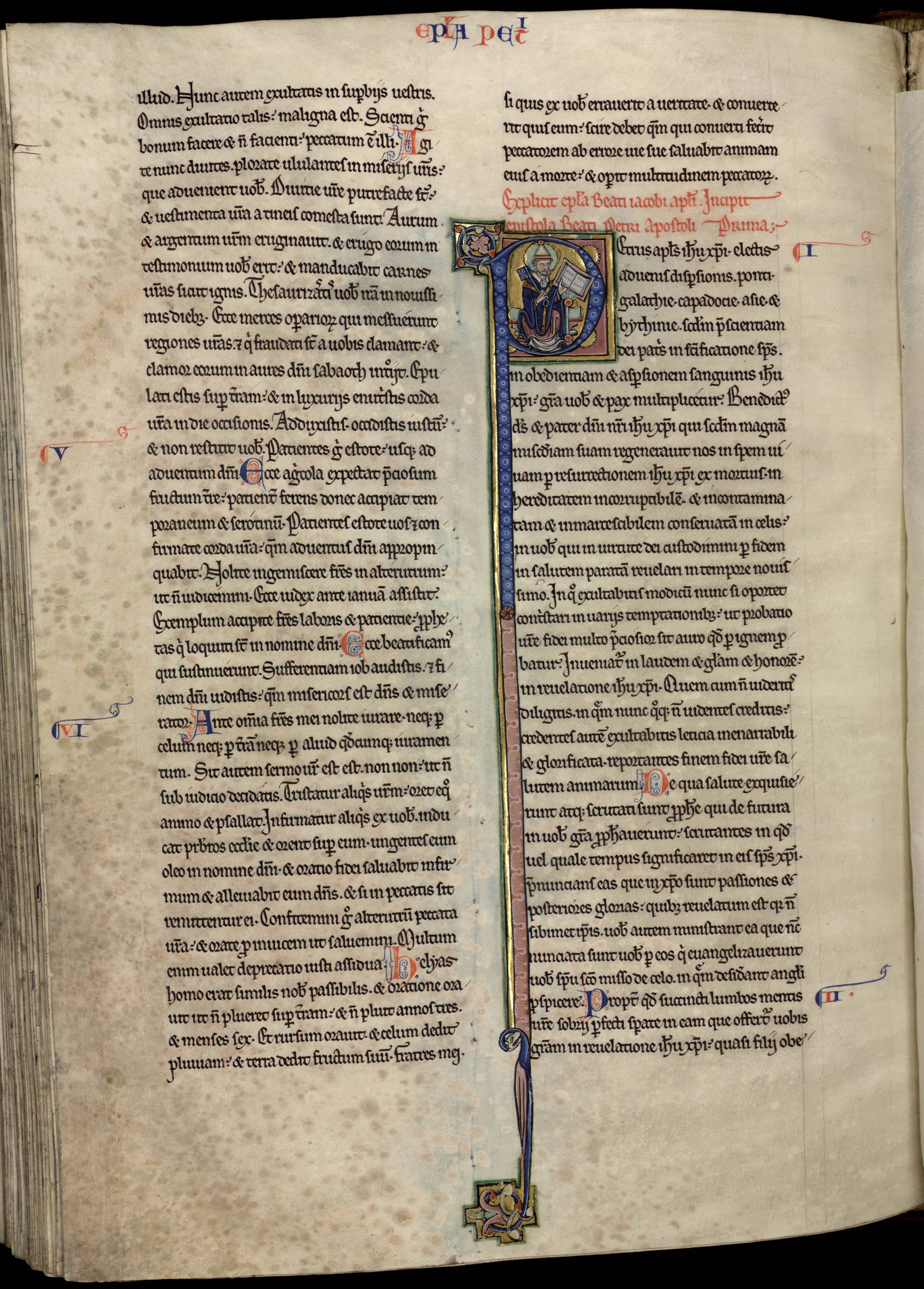 ur cette double page, on rencontre un P (« Petrus ») avec une longue prolongation marginale. Cette lettre historiée montre saint Pierre, lisant et tenant une grande clé (qui représente le pouvoir délégué à l’Église). Né juif en Galilée, cet apôtre est considéré comme le premier évêque de Rome.